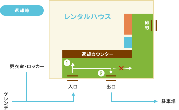 | お願い | ・平日は16:00、土日祝日は16:30までにご返却ください ・レンタルウェアのポケットに忘れ物がないか今一度ご確認ください ・ご家族・グループの方は全員が揃わなくても返却できます 準備ができた方から本人の貸出し証をご持参のうえおひとりづつご返却ください |